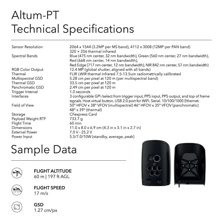 The Altum-PT is the best-in-class multispectral camera with synchronized thermal images applicable for production agriculture, phenotyping, and environmental monitoring. It captures synchronized multispectral, thermal, and panchromatic data for pixel-aligned outputs at incredibly high resolutions for advanced vegetation research applications. These comprise plant health monitoring from early emergence and on, with thermal for water stress and irrigation system monitoring as well.